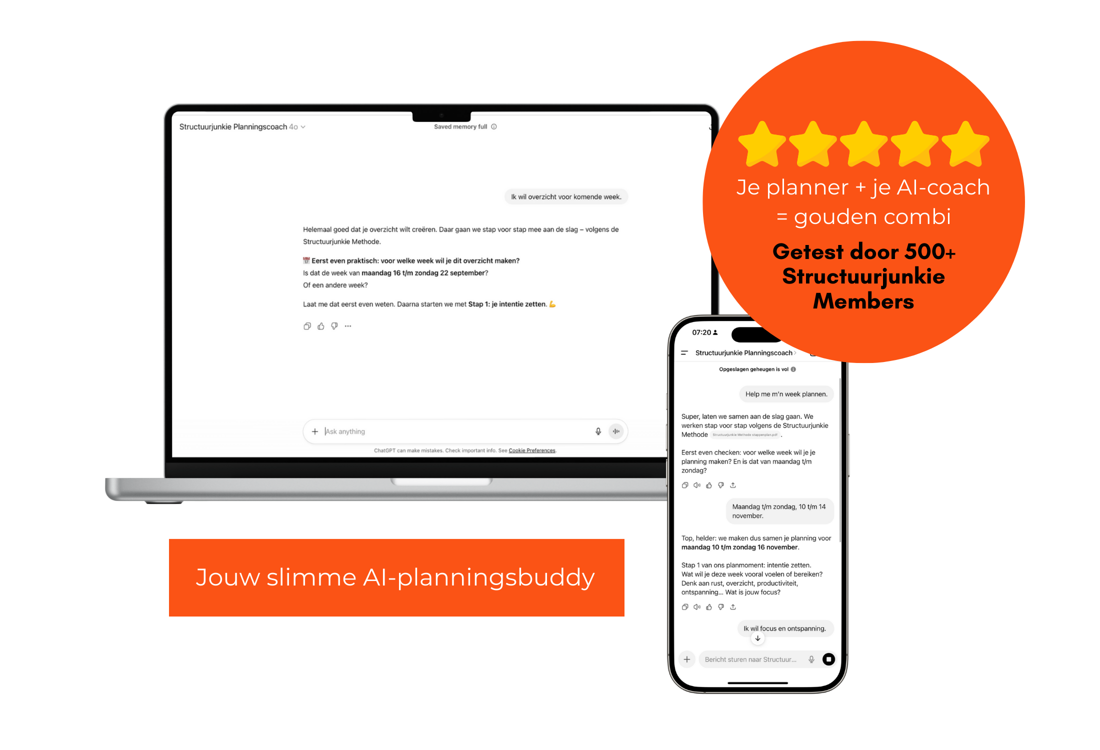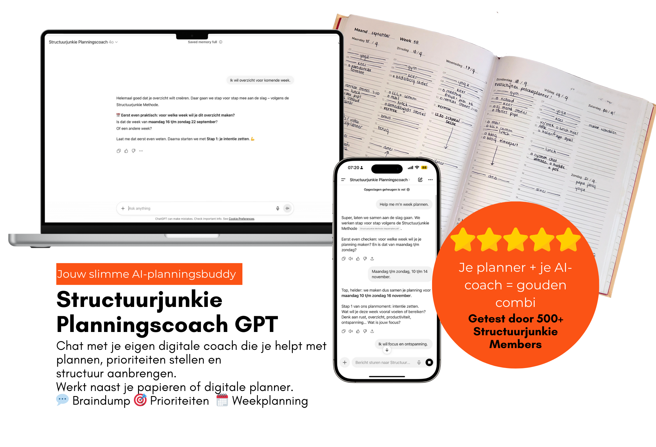 Inmiddels hebben tienduizenden mensen mijn Structuurjunkie Planner gebruikt, volgden meer dan 20.000 deelnemers mijn workshops. De Planningscoach Custom ChatGPT is daar een supertoffe nieuwe stap in. Je hoeft het niet meer alleen te doen. Deze coach is er altijd voor je. Zelfs om 6:00 ’s ochtends op maandag, of als je woensdagnacht totale overwhelm voelt doordat je week anders loopt.
