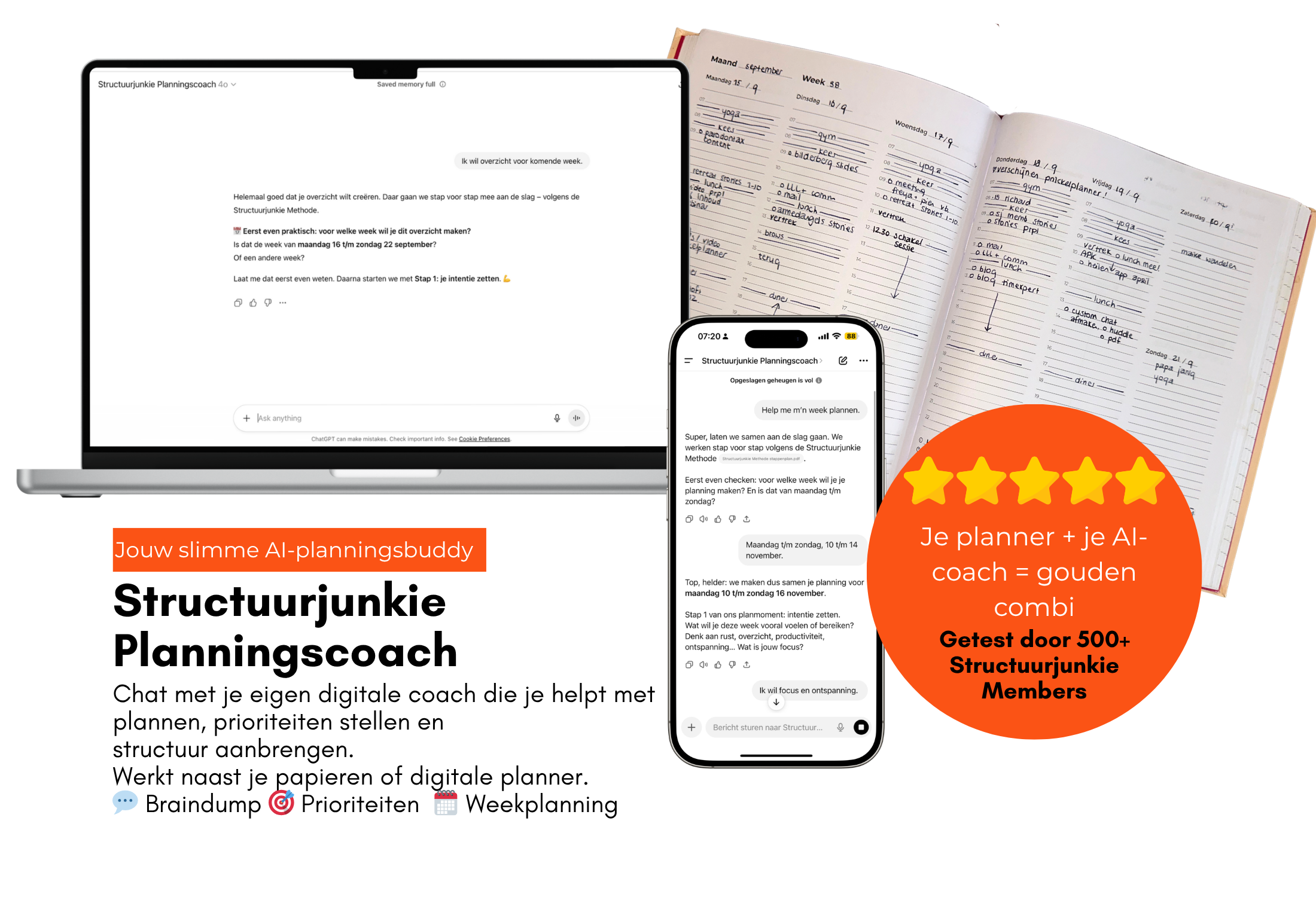 Inmiddels hebben tienduizenden mensen mijn Structuurjunkie Planner gebruikt, volgden meer dan 20.000 deelnemers mijn workshops. De AI Planningscoach is daar een supertoffe nieuwe stap in. Je hoeft het niet meer alleen te doen. Deze coach is er altijd voor je. Zelfs om 6:00 ’s ochtends op maandag, of als je woensdagnacht totale overwhelm voelt doordat je week anders loopt.